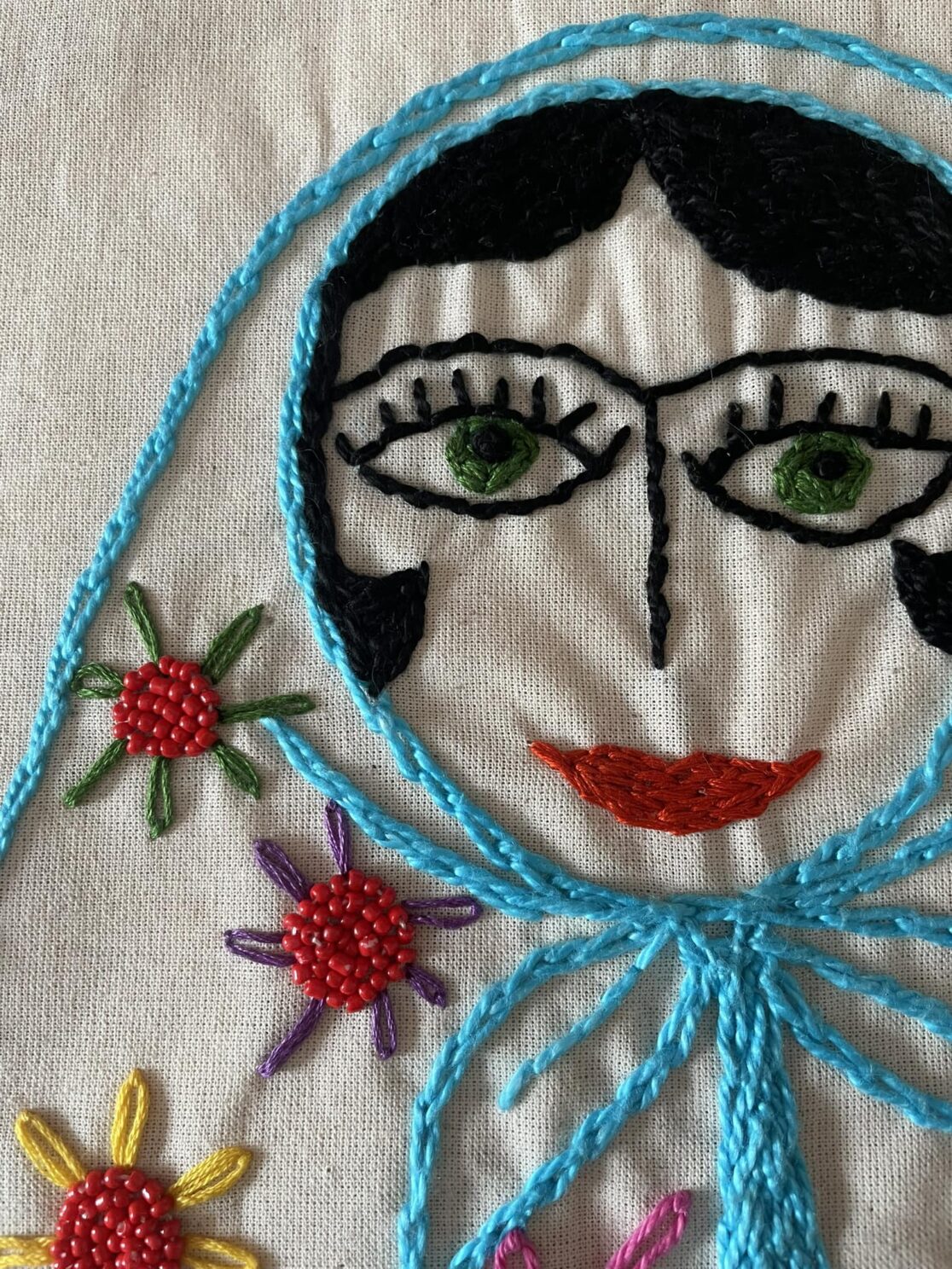 La broderie s’est imposée comme la technique idéale pour cette œuvre, car elle est répétitive, telle une prière mantra. De nombreuses croyances, dont celles de l’Iran, considèrent la broderie comme une forme de magie : lorsqu’on forme l’image à l’aide de l’aiguille et du fil sur le tissu, on insuffle un pouvoir à l’objet. Celui qui utili- sera cette broderie comme décoration ou objet chez lui devrait savoir qu’elle est empreinte de magie et peut apporter la bonne ou la mauvaise fortune.