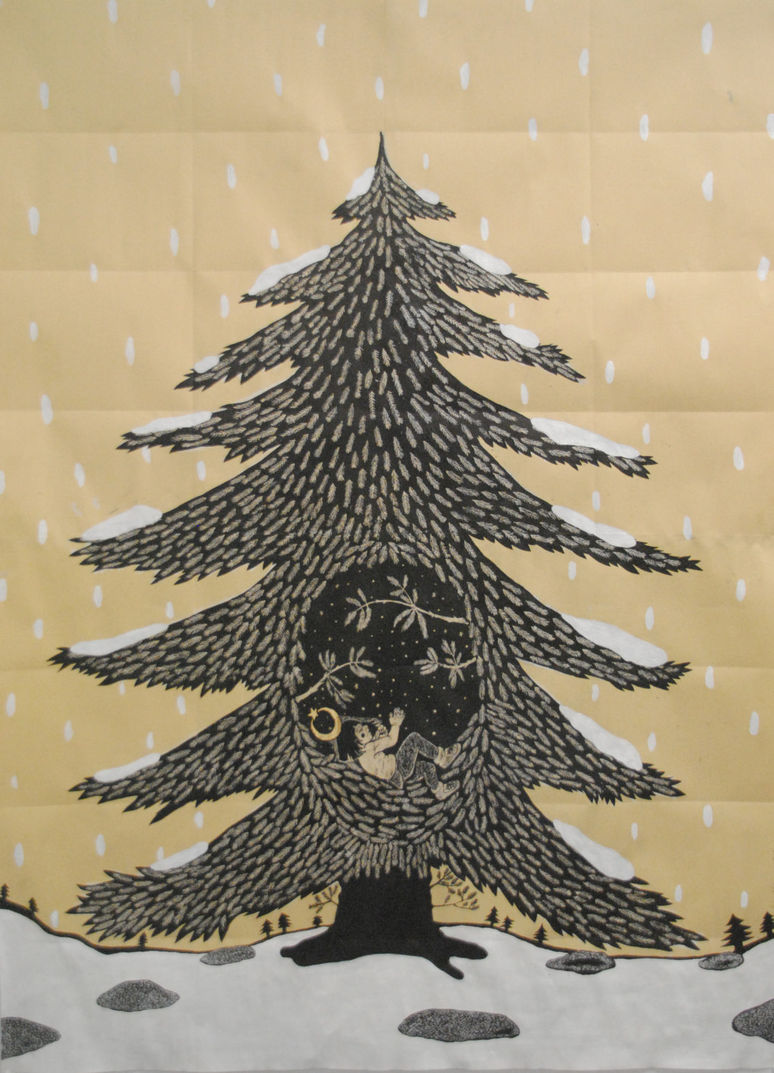 Inspired by the fauna and the Northern Lights, the dreamed worlds that she inks on paper immaculate with snow and enhances with gold leaf allow her to concretise the impossible.