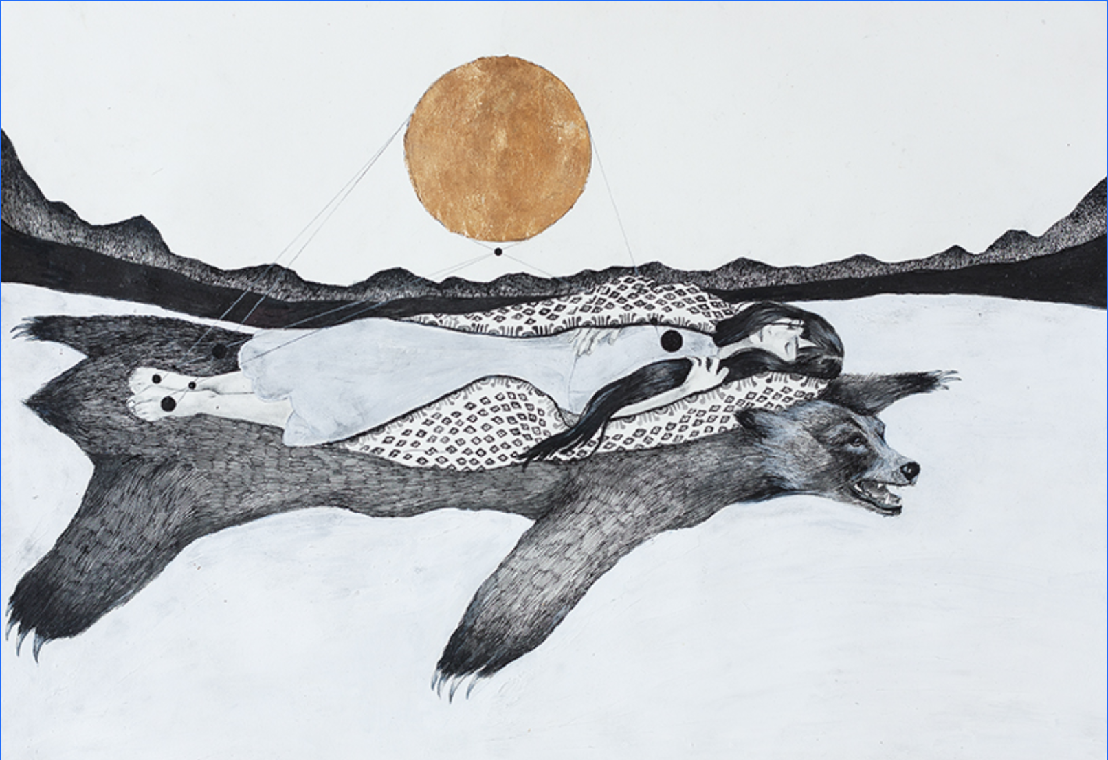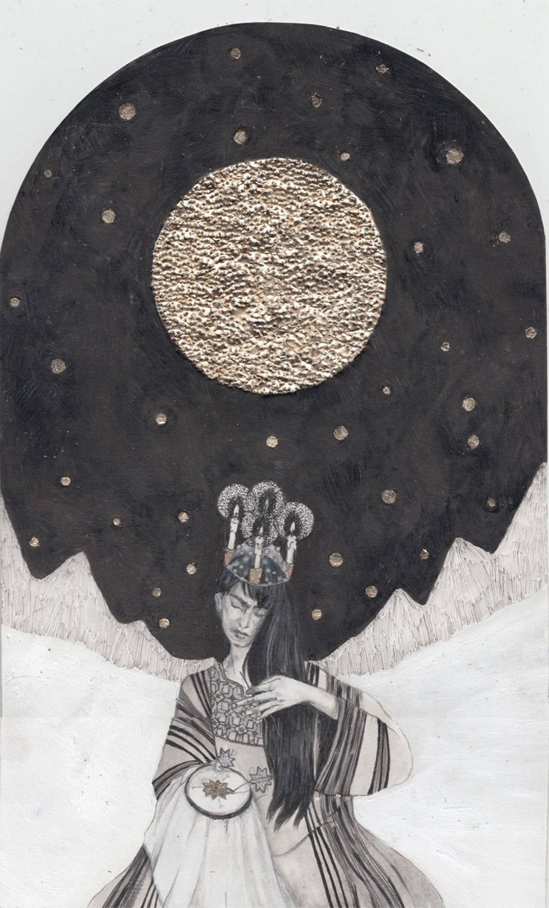 "Fallow me" Pencil, Rotring, Indian ink, acrylic and gold leaf on paper 30,7 x 30,7 cm 2015